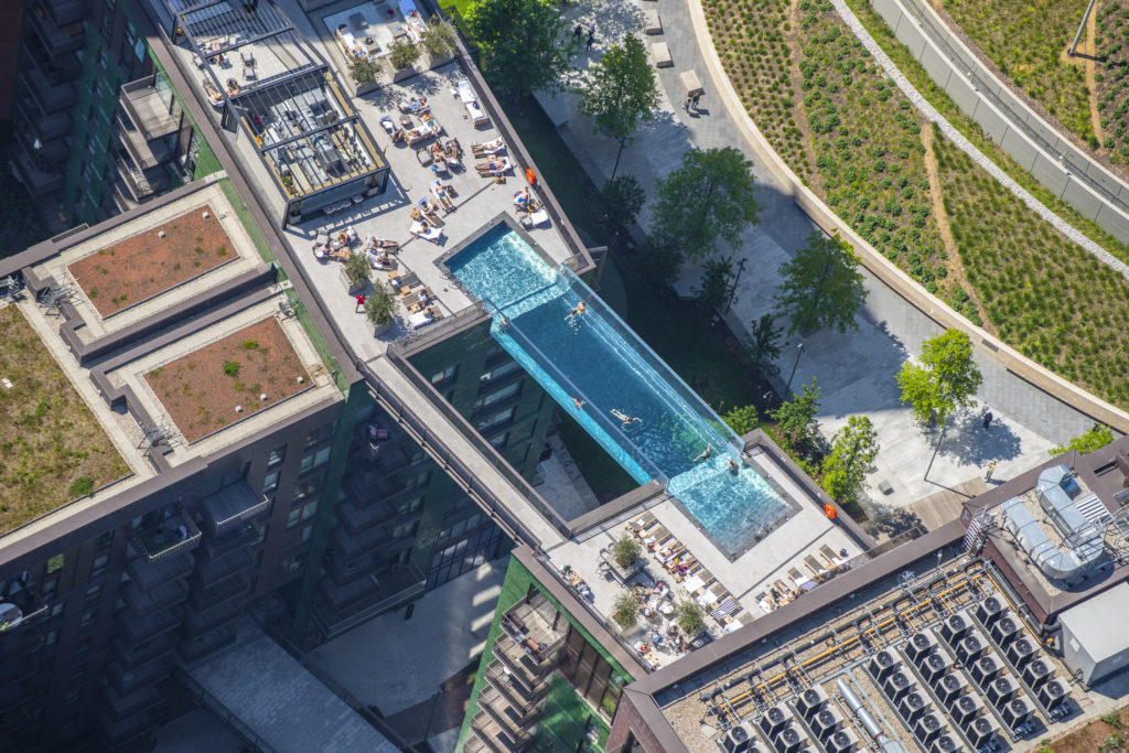 Image précédente Image suivante The new Sky Pool, an acrylic transparent swimming pool stretched between the 10th stories. EmbassyGardens, NineElms, London. © Atlas Concorde