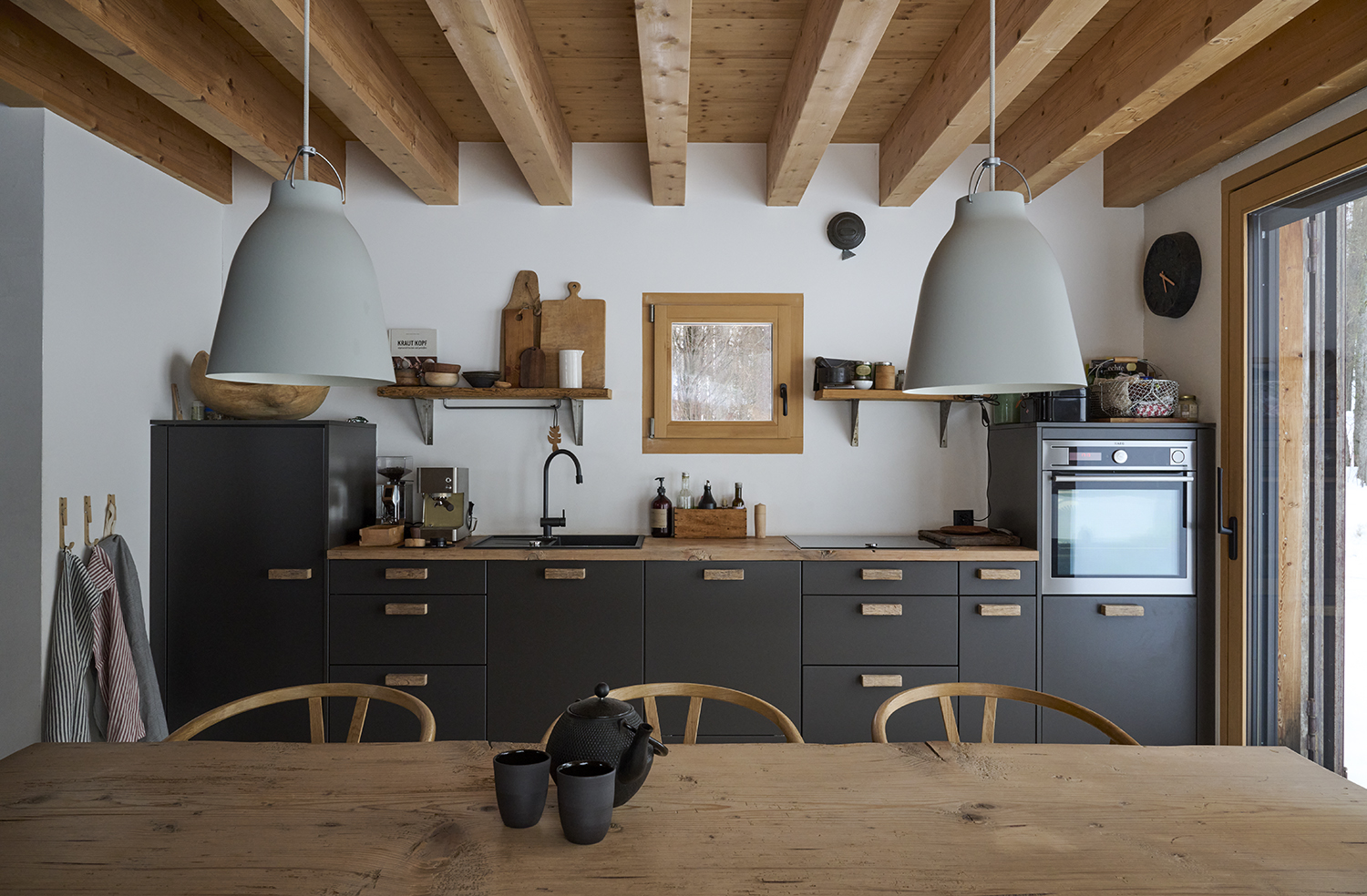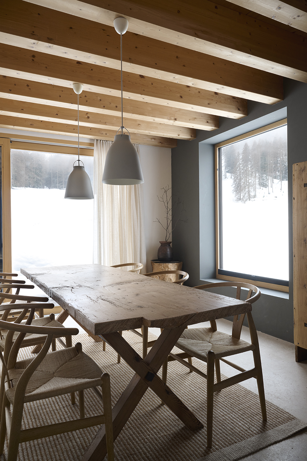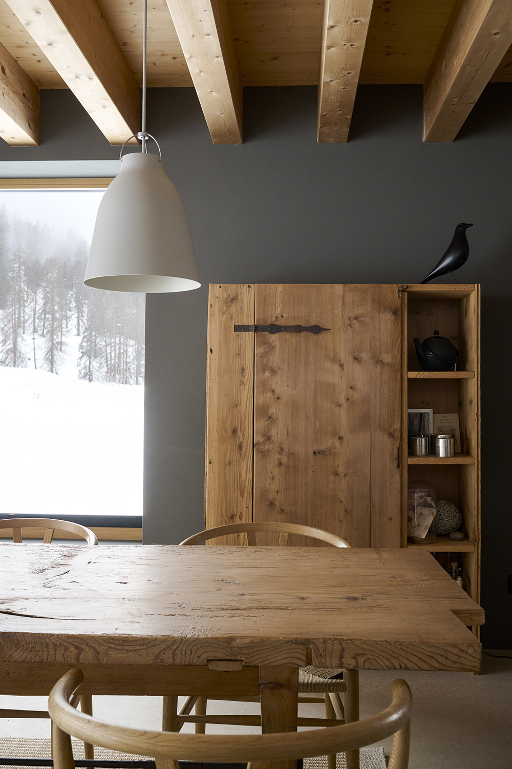 Dans les vallées grisonnes où la quantité de neige peut être impressionnante en hiver, des poutres massives soutiennent la structure de la maison. Les poignées des meubles de cuisine et le plan de travail ont été conçus et fabriqués par Ralph