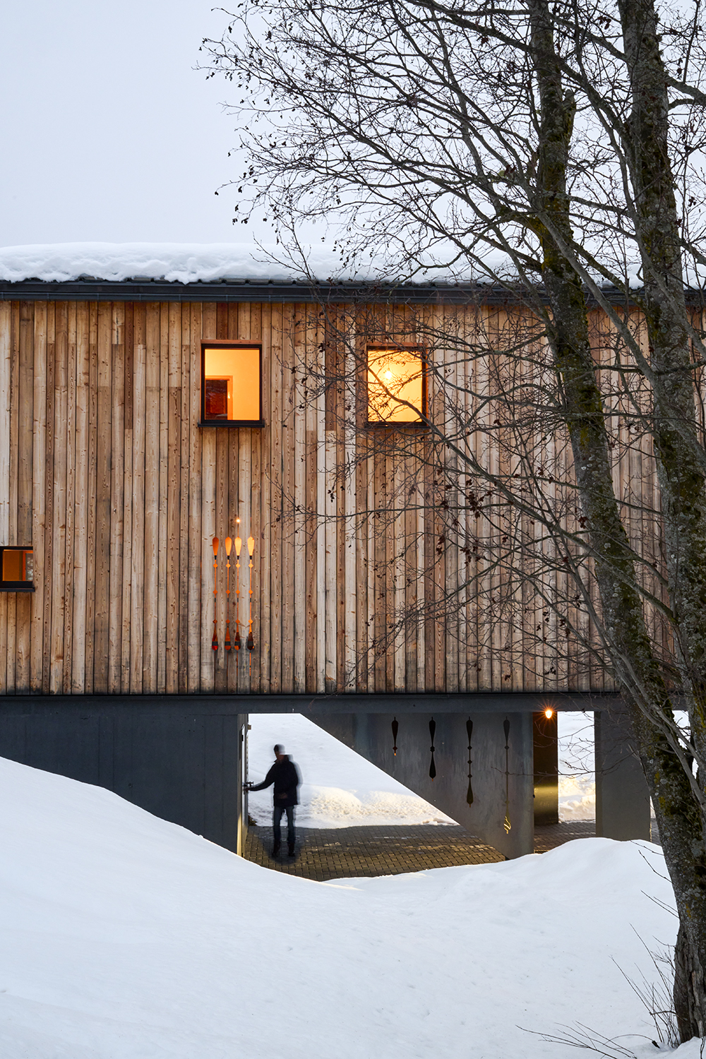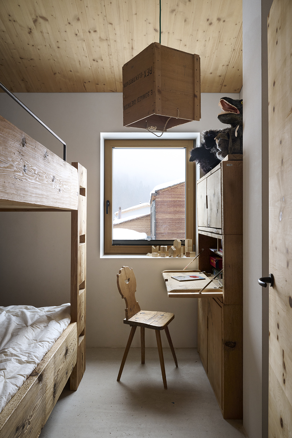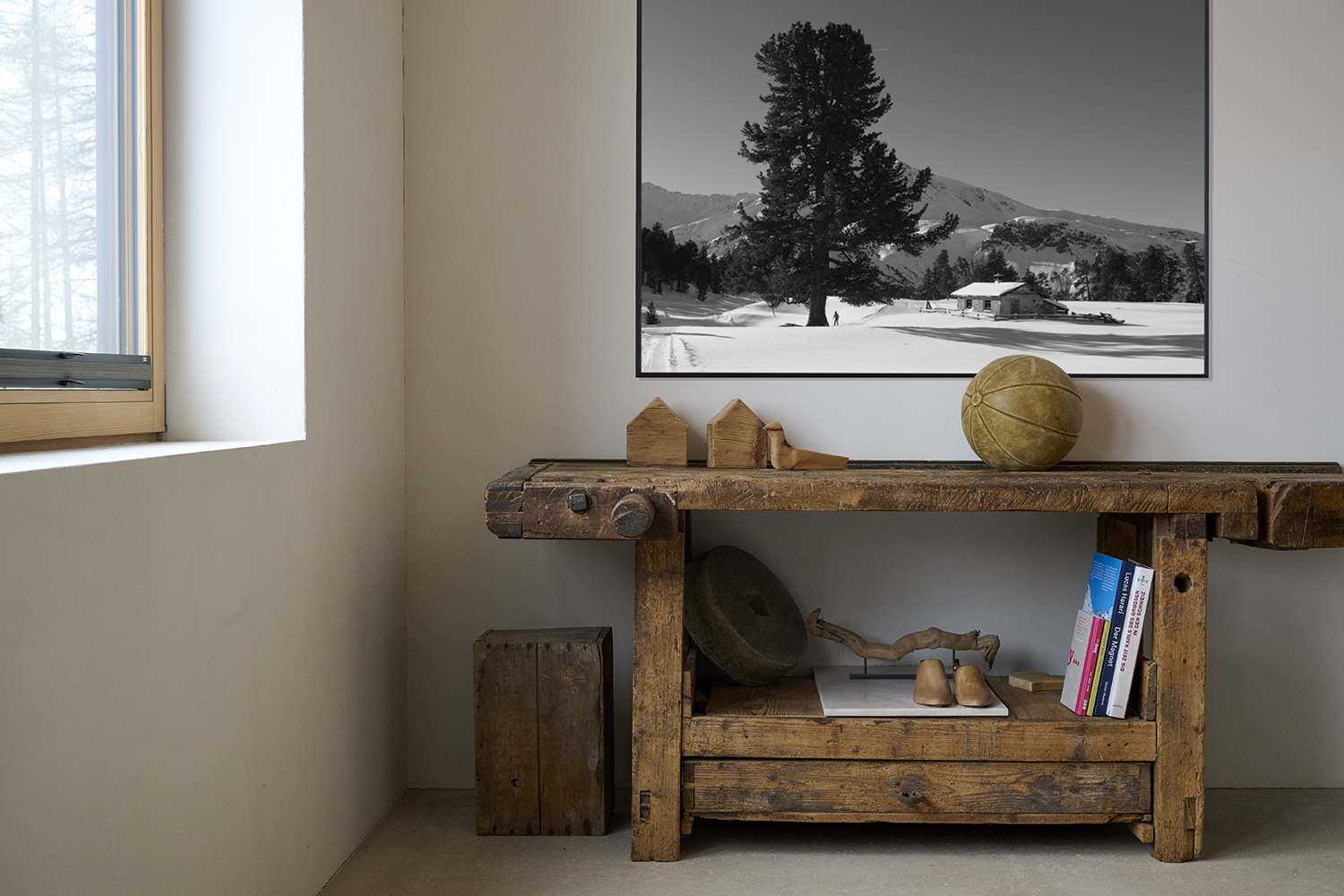 Dans les vallées grisonnes où la quantité de neige peut être impressionnante en hiver, des poutres massives soutiennent la structure de la maison. Les poignées des meubles de cuisine et le plan de travail ont été conçus et fabriqués par Ralph