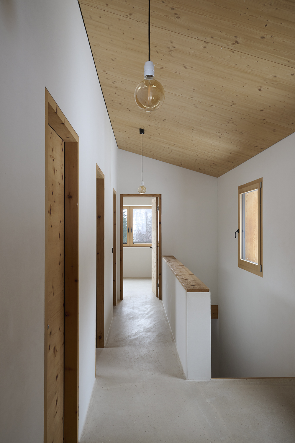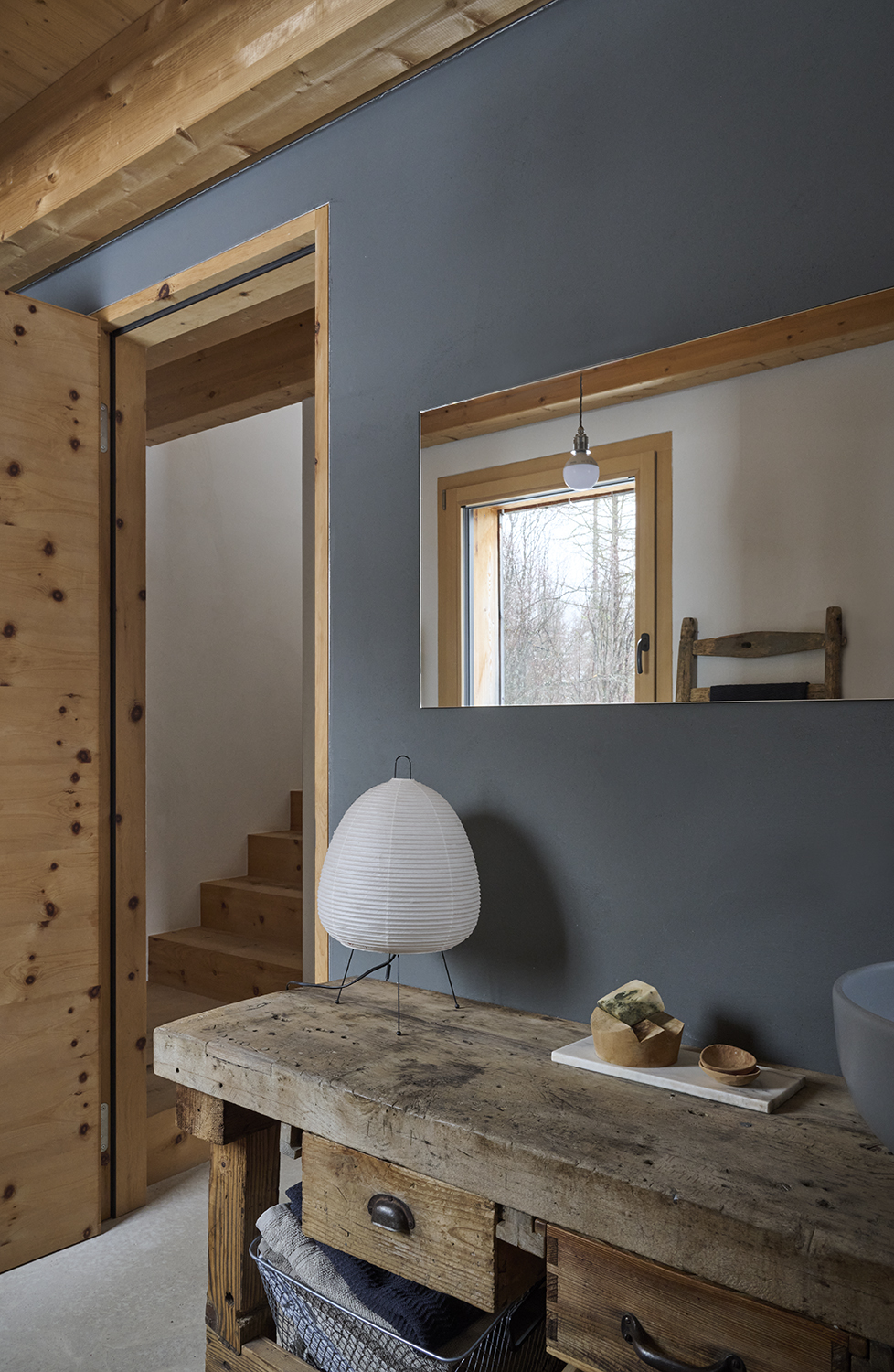 des matériaux simples et économiques. Dedans, le sol est une chape de béton poncée et huilée et le plafond est en bois brut d’épicéa clair avec de massives poutres apparentes. Les murs, peints en blanc et en gris