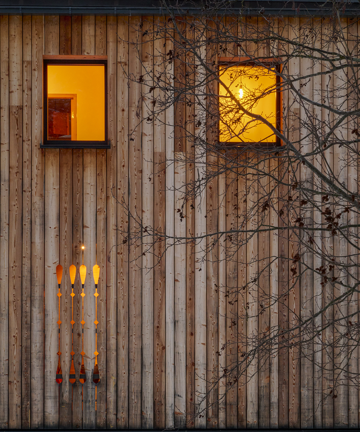 La façade de la maison est revêtue de mélèze, avec des fenêtres aux cadres noirs et un socle en béton teinté de la même couleur. Le toit est en tôle noire. Pour l’intérieur comme pour l’extérieur, nous avons opté pour