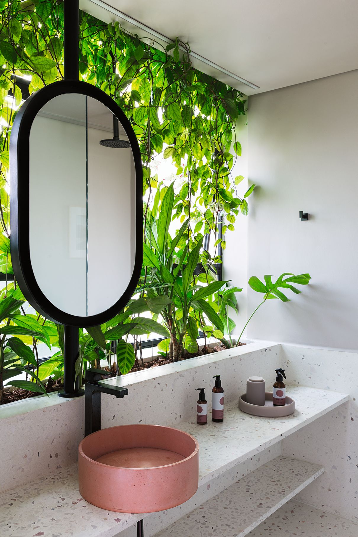 Une longue jardinière est intégrée au mobilier en terrazzo. Vasque ronde UMA Concreto.