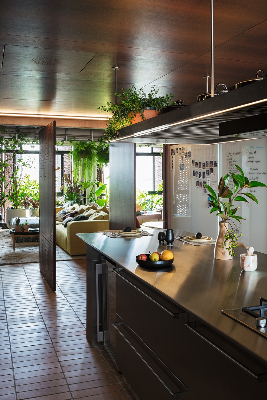 La végétation luxuriante, point fort du projet, attire immédiatement l’œil. Une jardinière sous plafond traverse tous les espaces et, avec les pots posés au sol et ceux suspendus, elle forme un véritable écosystème. Cette petite portion de jungle court le long des grandes fenêtres, sur des fils servant de guides au plafond, et il y a même un potager… Le tout équipé d’un système d’irrigation automatique. Ici, le concept va au-delà de la tendance de «jungle urbaine», adoptée avec ferveur pendant la pandémie par les jeunes branchés de São Paulo. «La végétation améliore non seulement le bien-être, mais elle augmente également le niveau d’oxygène dans l’environnement, ce qui favorise la créativité. Elle réduit également la pollution et évite les irritations des yeux, par exemple», explique l’architecte.
