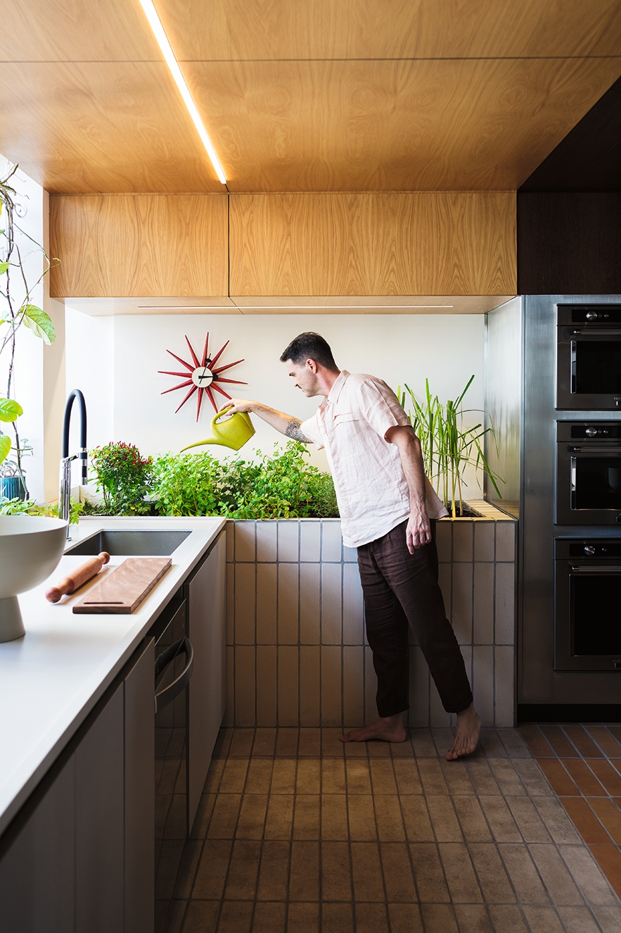 La cuisine abrite un potager intégré dans un bac en céramique. Plans de travail Silestone.