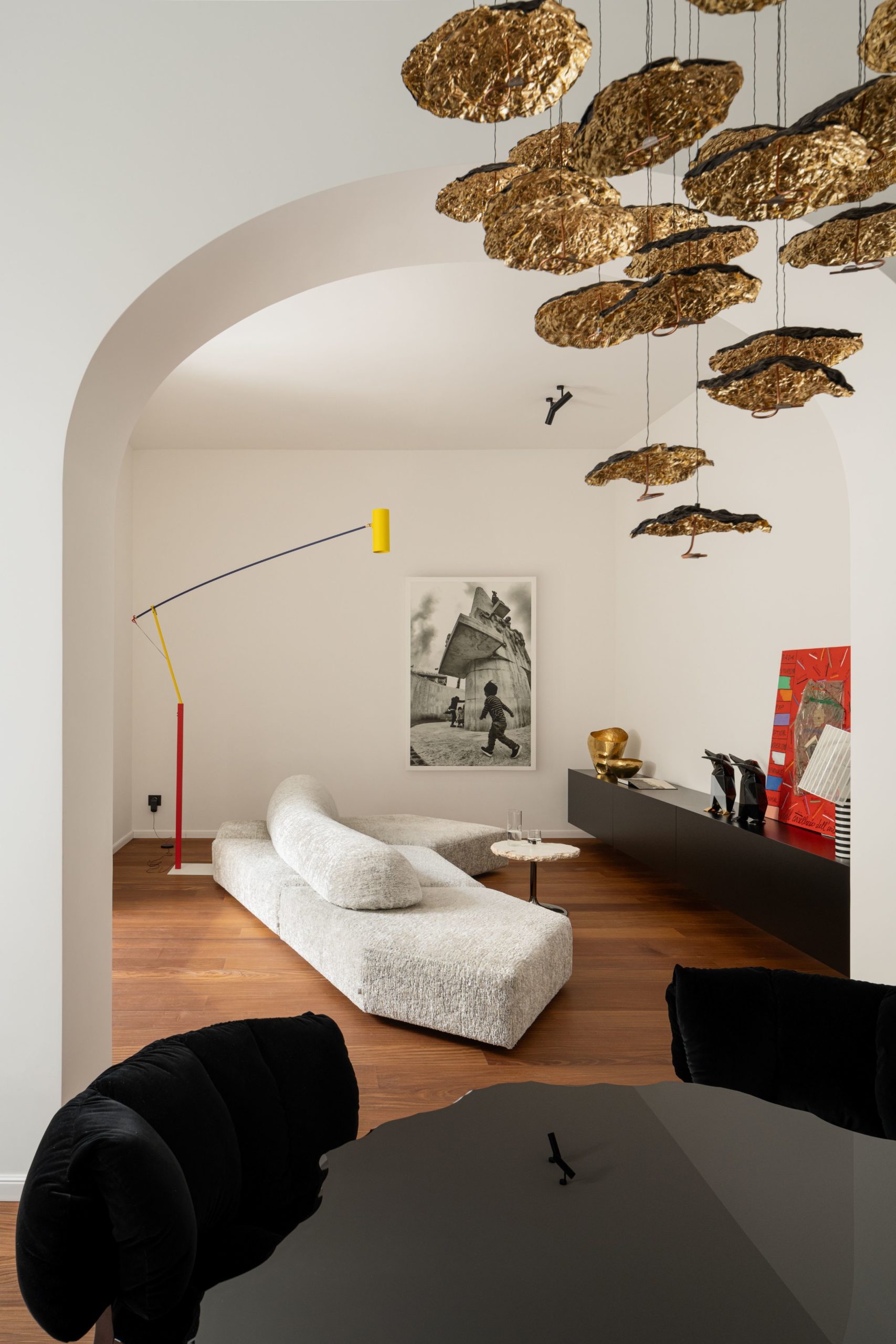 À l’entrée, des arcs communicants ouvrent la perspective jusqu’au séjour, en passant par la salle à manger. Autour de la table, les fauteuils Blue Velvet d’Edra.
