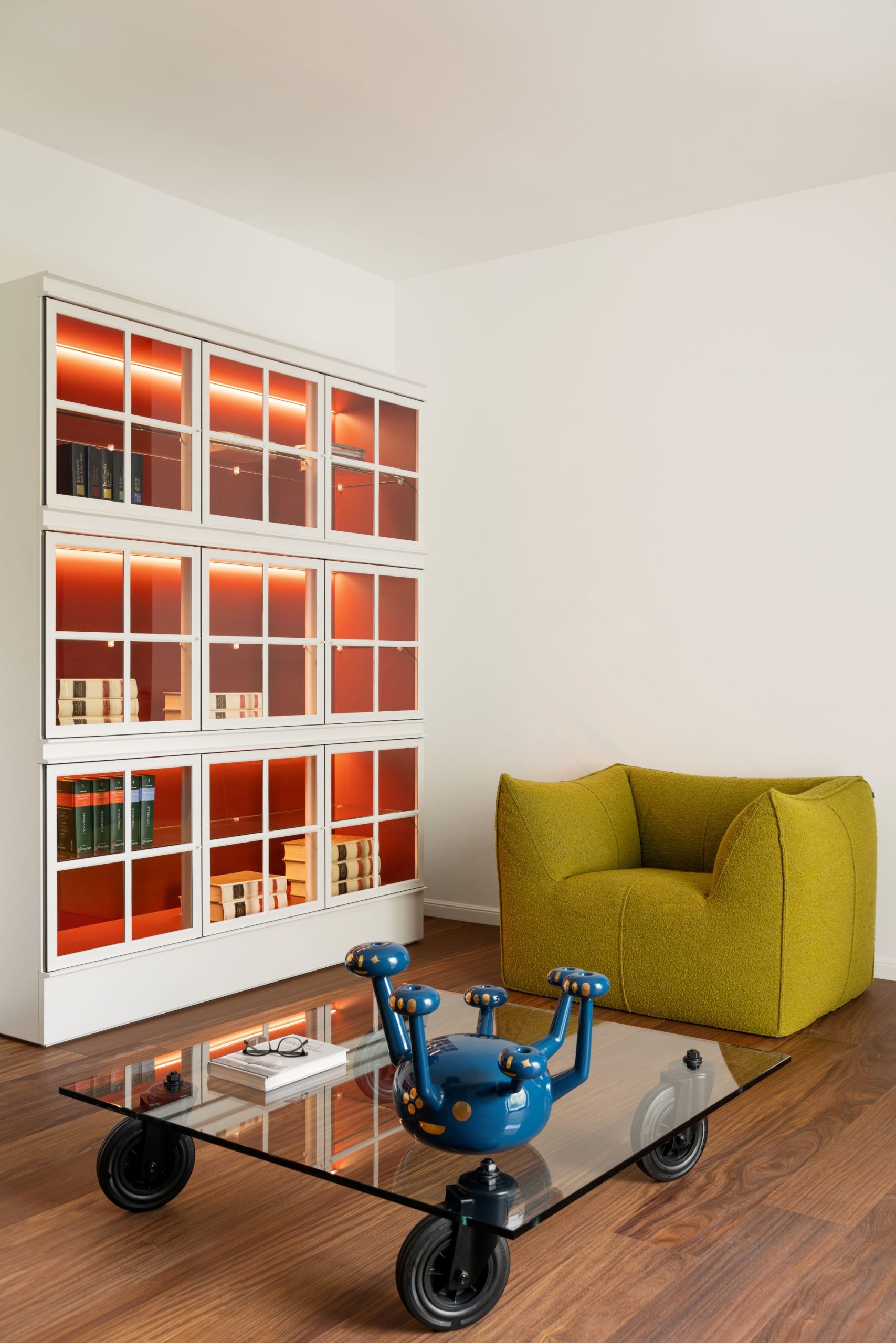 La salle de lecture, le fauteuil Le Bambole de B&B Italia dialogue avec la bibliothèque Piroscafo de Molteni&C et la table basse de Gae Aulenti pour FontanaArte.