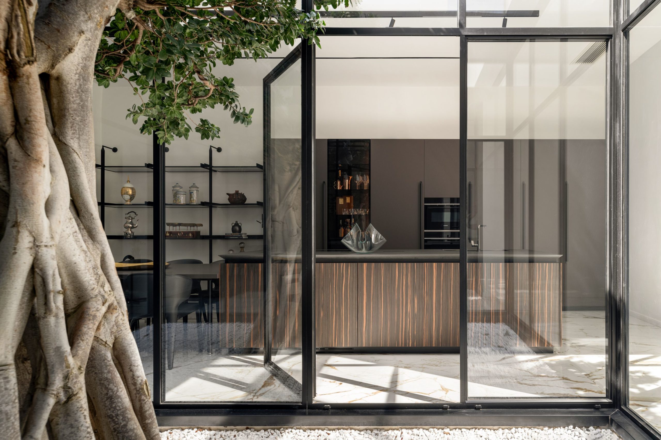 Au cœur du rez-de-chaussée, le patio accueille un majestueux Ficus Benjamina.